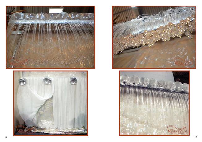 Ламбрекен сделан на основе светодиодной ленты, вложенной в кабельный канал, который мы резали лазером. Каждая бусина крепилась в четырех местах специальным зажимом на оптоволокно. На ламбрекен ушло около 2000 метров оптоволокна, 2500 бусин, 10 метров светодиодной ленты, блок питания, 28 хрустальных шариков и 10000 стопоров бусин.